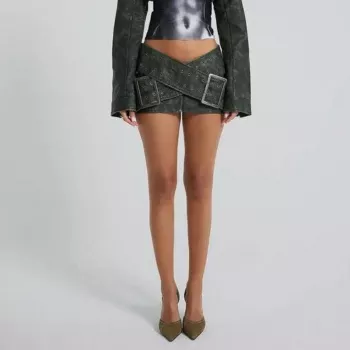 Cyberpunk Y2K Faux Leather Wrap-Around Micro Mini Skirt with Belt