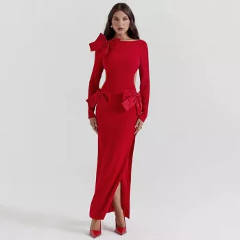 Elegant Red O-Neck Backless Bow Maxi Dress